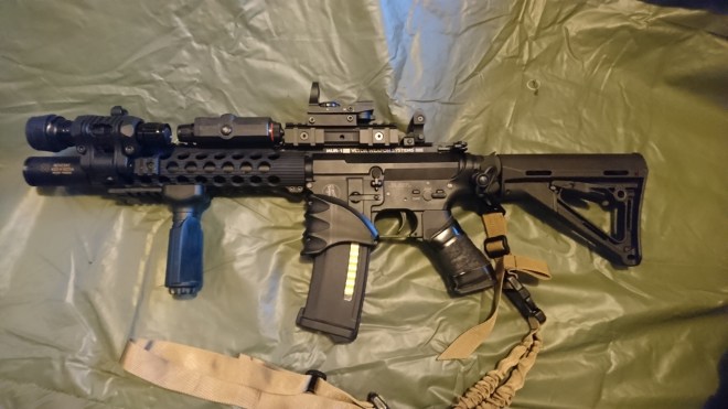 This originally was a G&P M7a1 (hah! It’s not actually an M4! Technically anyway). The externals are stunning, featuring a VLTOR upper receiver, Troy Arms lower with Troy Arms 9″ battle rail and Troy Arms flip up iron sights. It’s since had a few additions, like the CTR style stock, and reflex sight which I like because you can still see what’s going on around you, instead of focusing down a scope. Sounds odd for a sniper but trust me. Internally, it’s had a full rebuild with ASG parts after dropping power, and has a guarder clear bucking along with a couple of DIY mods. Sling is a basic single point bungee, and I’ll be taking a silencer along with it.
