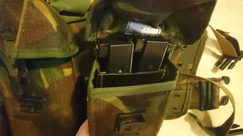 In terms of pouches, quick access pouches like the open-top bungee ones above are a very bad idea when you’re crawling through the dirt. Getting any dirt onto the exposed bb at the top of the mag is going to then put dirt into your gun and really start messing things up – this can lead to jams, and the next shot could result in bb’s shattering into the jammed one causing all sorts of problems inside your gun and putting you out of action. My mag pouch is always a closed type, with a clip fastening (not Spanish clips, definitely not velcro…). This is a Dutch Army double M4 DPM pouch, which is great because it comes with a plastic divider that securely holds up to 4 VSR mags. Or, more commonly, three plus a speedloader. Old school surplus mag pouches do a much better job of keeping things clean than the modern stuff.