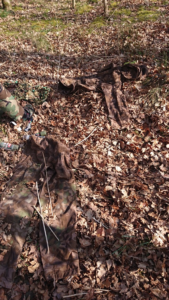 On the camouflage front, it’s not a case of just sticking cheap Chinese maple leaves all over a leaf suit and assuming that’ll work. It does, but that’s the most basic level of camouflage. I’ll admit, I’ve been there but quickly got fed up of the limitations of a leaf suit. I subscribed to the church of Haloscreen and the teachings of Le Covert and Theyma. Find them on Facebook. Learn to understand camouflage properly. How colours interact with the environment, how light affects the materials you use, morphological issues, reflectance, macro (big) and micro (small) camouflage patterns. There’s a lot more to it than just looking like a pile of leaves. Take lots of pictures of the sort of environment you’re working in. Find a suitable base camouflage and modify the colours and pattern using spray paint.