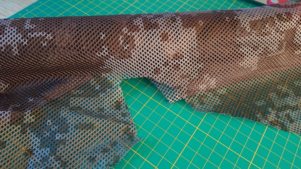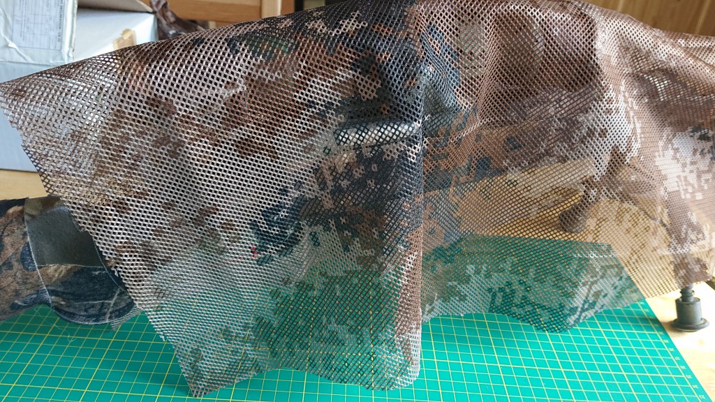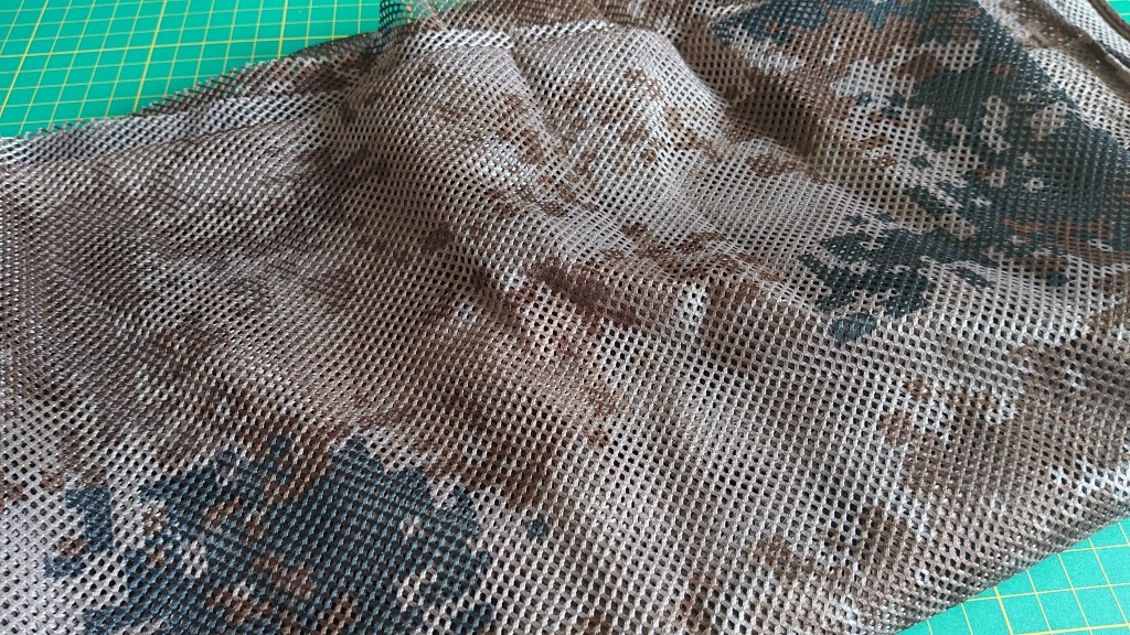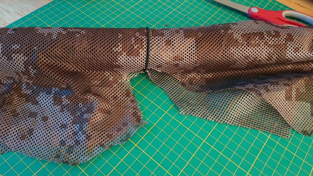 First up, you need a base mesh. I got this off Point6 who found it on AliExpress, and cost less than a pack of beers. I’m glad I made the right choice, and bought both. It’s based on the Chinese Type 07 Arid, from what we can tell, and has a good mix of dark and light browns which should match the dirt nicely. I put one edge over the top of the rifle so it just reaches the table on the other side, and then cut it to match. Not that I have a Harris bipod attached here, I don’t use it in games, but it does help with tech and camouflage work like this.