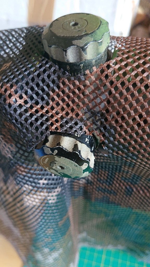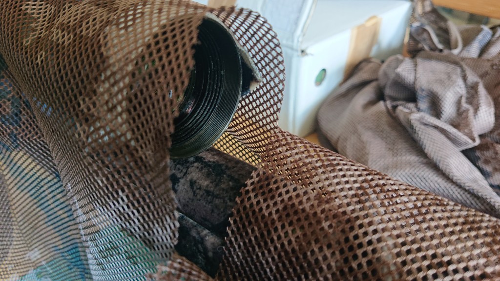 Cut a straight line just in front of the scope so you can see out. The mesh isn;t too bad to look through if you decide not to, but I have a lens cover to go over so it’s not needed. Don’t ignore that big black scope circle ever, always try to soften the egdes. I’ve cut just in front to create a little “hood” that drops down and helps hide the circle outline of the front of the scope.