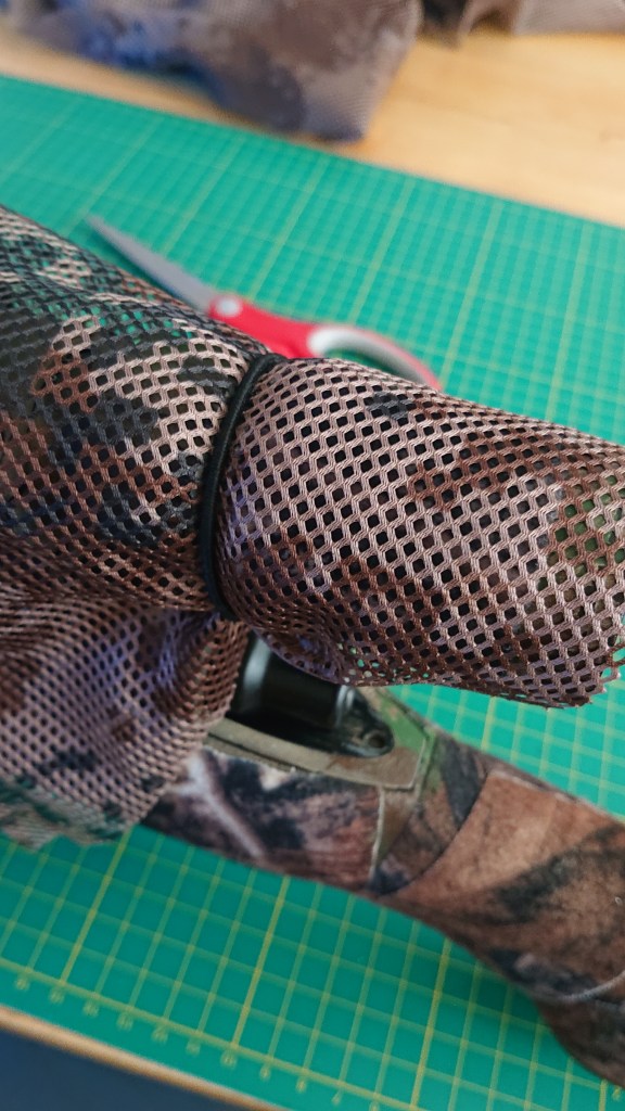 The whole thing is held in place with a couple of hair bobbles, one at the front of the barrel and one at the back of the scope. I’ve cut a notch where the barrel bobble sits. This will also stop the wrap from bunching up if you do use some form of elastic. Because I run a massive fat silencer, I’ll be getting some velcro to hold that all-important front end in place, but I also want to do some seperate camo for the silencer anyway – it’s size presents a similar problem to the scope, in having a clearly visible circle. It doesn’t stay on the gun unfortunately, purely because my gun bag is a little small.