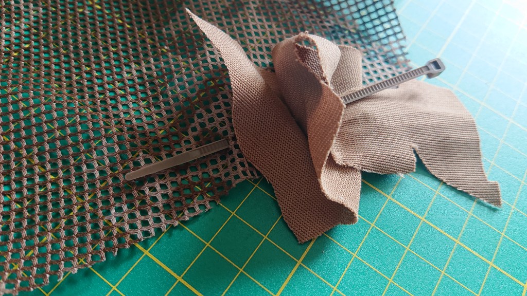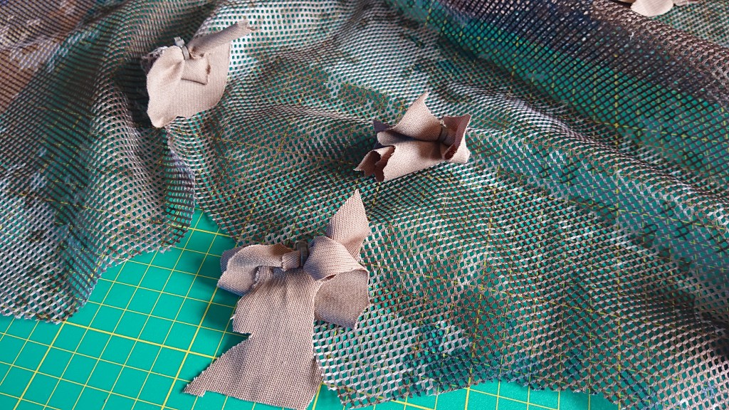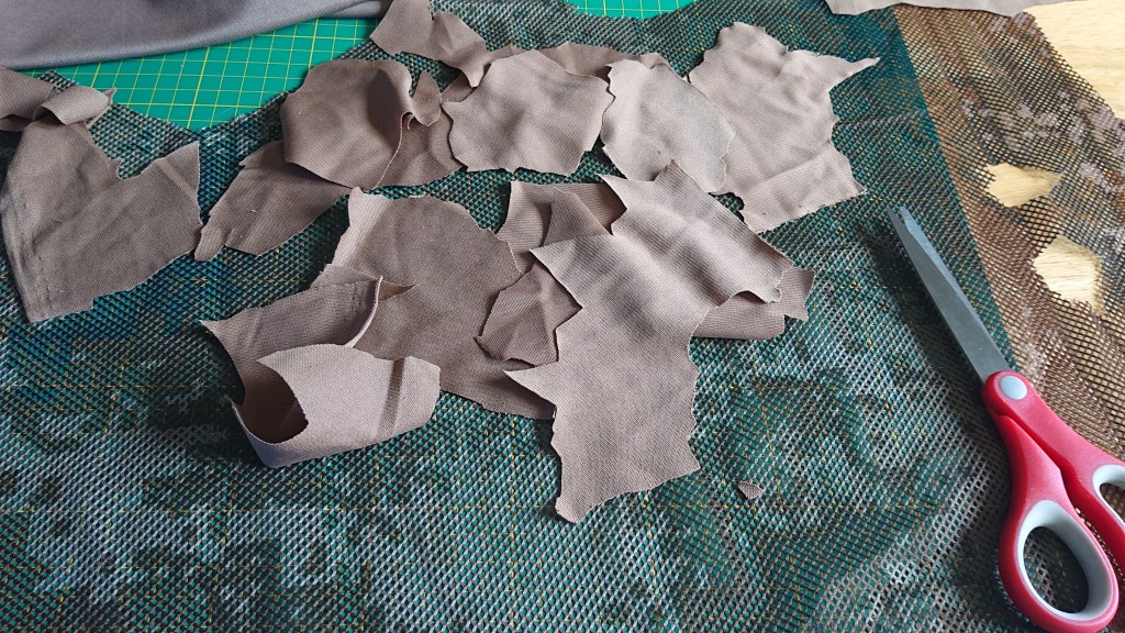 For decoration, as I mentioned at the start, I’m using the new Nanoscreen material from Le Covert Sartorialist to mimic the dead leaves and debris on the ground. Haloscreen will be added to mimic the greenery, and I have a couple of other materials to add on afterwards – coconut rope and raffia to replicate sticks and dead grass. Of course, you’ll need to tailor your camouflage to the season and environment required, but of course you can make a few of these to help you adapt. If you do keep a stock of camouflage materials in your house, the only real cost of a wrap is the base fabric, which can be found pretty cheaply if you know where to look.