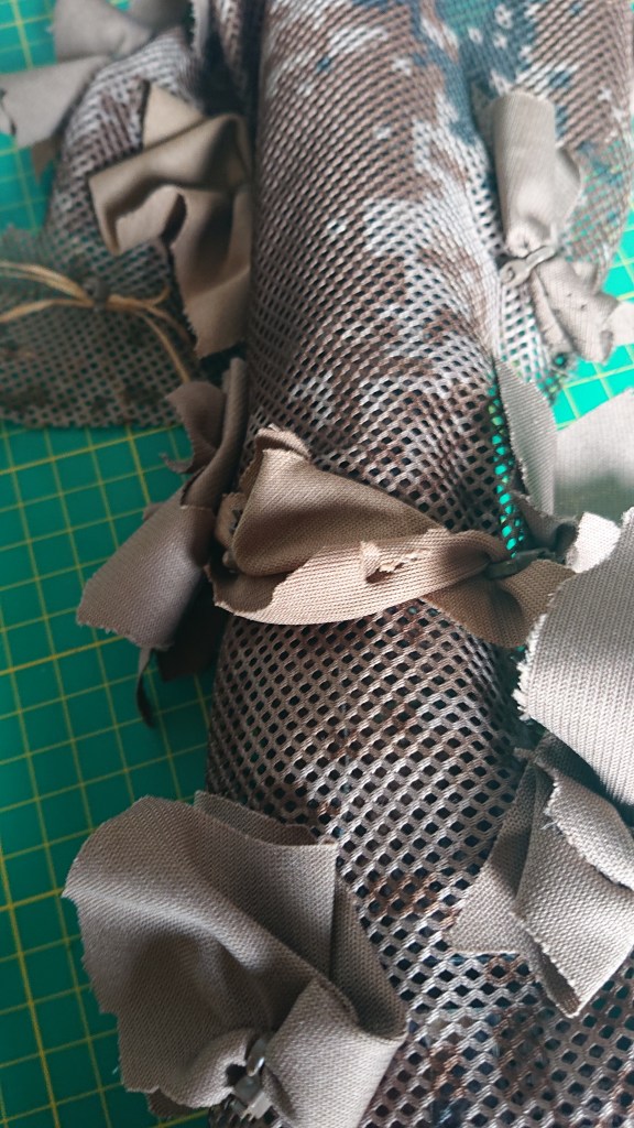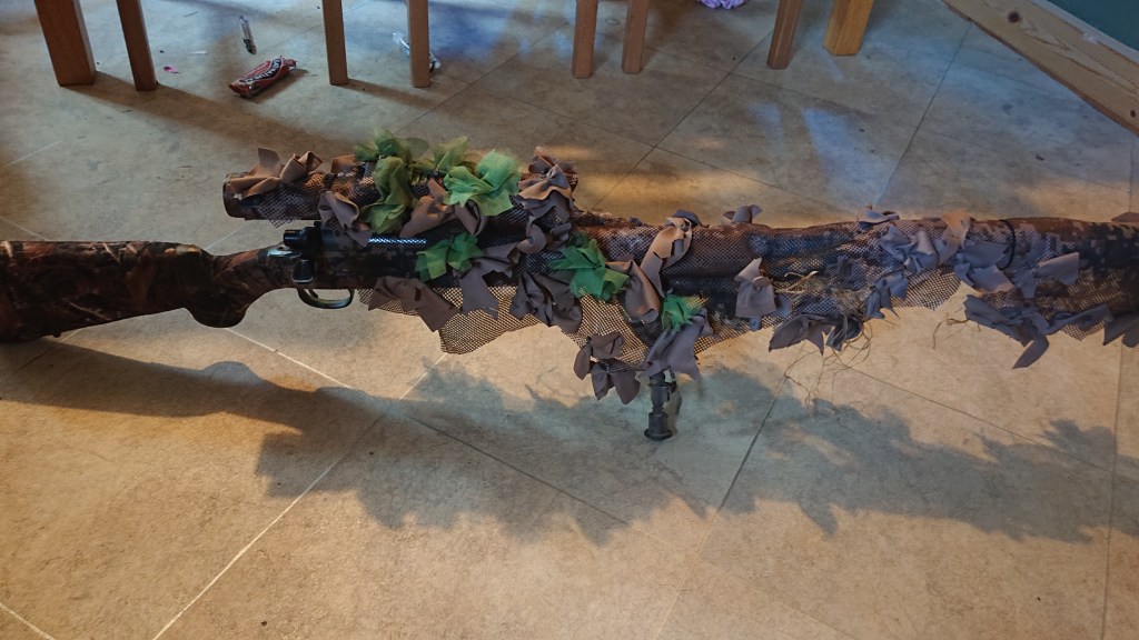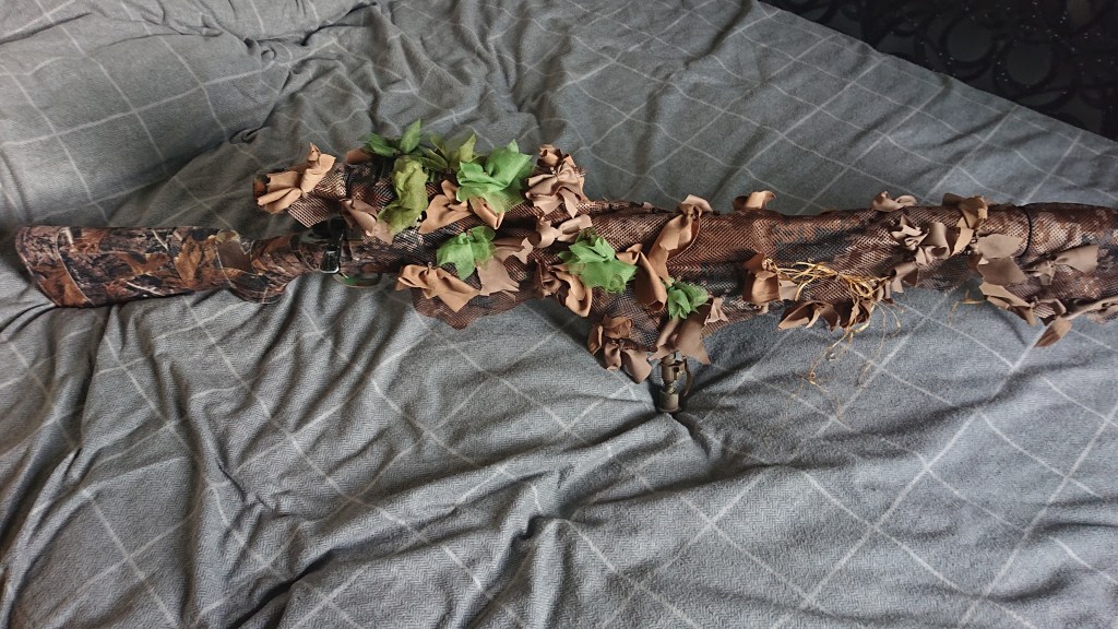 Rifle wraps, on top of taped rifles, are the answer. Simple and straightforward to make, they can be made to hang down from the rifle and disguise that long thin barrely shape, and if you use a mesh fabric for it, it’s dead easy to attach 3D elements, like Haloscreen, to help break up the shape further. It’s just a big, baggy sleeve and you could then make a few for different seasons and environments.