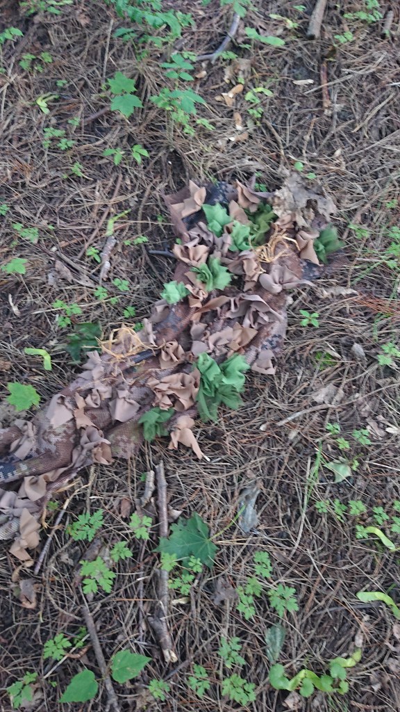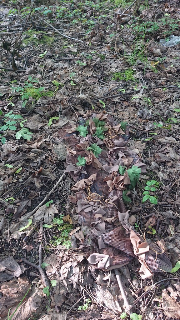 ALWAYS TEST YOUR CAMOUFLAGE OUTSIDE. After this first testing, it’ll be back in to change a couple of things, add more materials, then back outside to test again. At the moment it’s probably about 25% done, but that’s better than doing 100%, realising it’s totally wrong, and starting again…