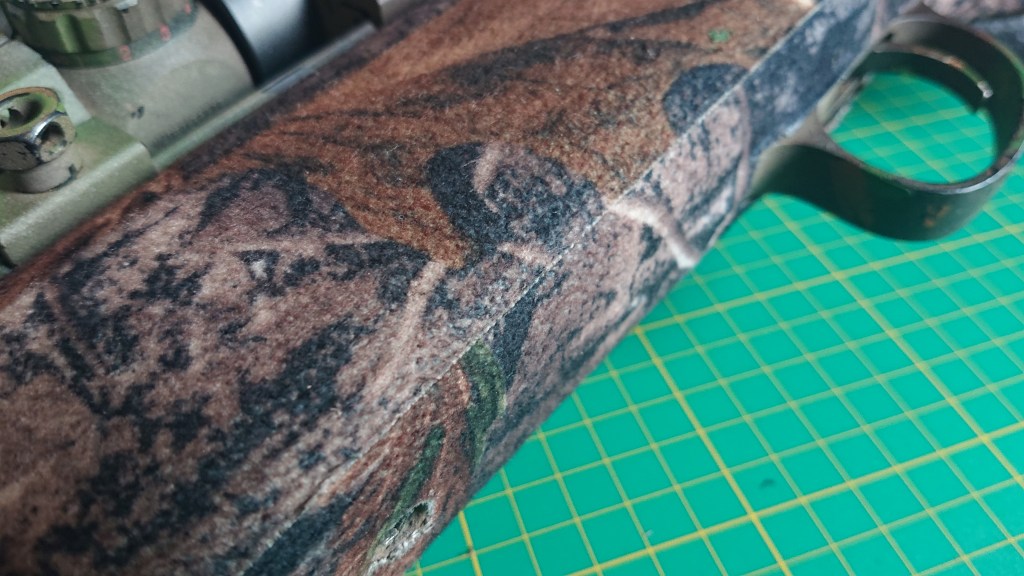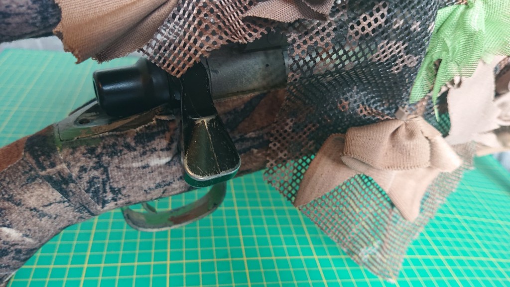 Rifle camouflage, for some reason, tends to be largely ignored in favour of shiny black guns, or funky paint jobs, and yet usually it’s the first thing you see of a sniper. Honestly, the lack of effort on some given the effort on the ghillie suit makes me cry, often with laughter. Now, for a lot of years I did rely on camouflage paint jobs, and I was damn proud of most of them. But no matter what I tried, or how matte the paint was, the rifle body always had a sheen to it because it was a smooth surface, and you can’t hide that with a smooth paint job even if you stencil an amazing pattern on. Yes, it looks good, but it doesn’t work. In later years, I switched to camo tape, which had the added effect of making the gun stock a bit quieter when shooting by absorbing a little vibration. My tape of choice is the Jack Pyke Tough Tape, which has a furry fabric finish to it that kills that shine, and the colours are pretty decent too. The only other tape I’d ever recommend using is the British Army Sniper Tape, which is plain but you can decorate as you need, although it can be the better choice and you get a MASSIVE roll. Was I happy with it?