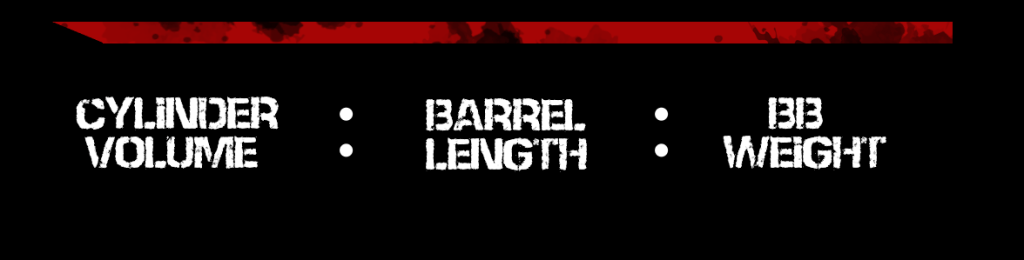 Cylinder Volume – needs to be matched to the barrel length. There’s an amount of air in the barrel in front of the bb, that needs pushed out first and remaining air is then used to power the bb. So if the barrel is too long, you’ll lose power trying to expel that extra air out.