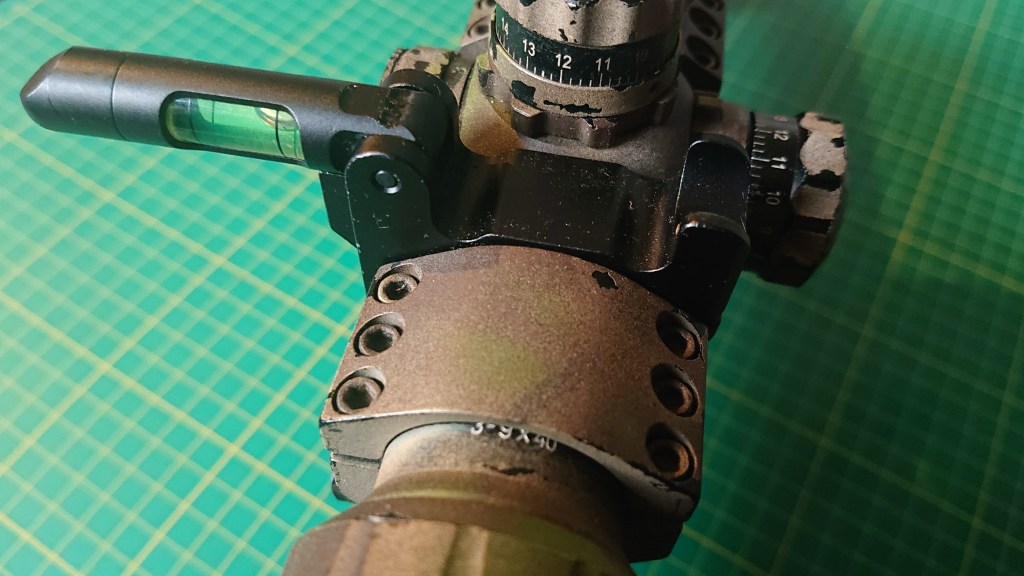 A scope spirit level, such as this one I got from Skirmshop NL, is very handy to have to ensure the gun is level while shooting, to help eliminate left/right curve and improve accuracy. It’s a very little thing, that doesn’t get in the way of rifle operation. Flipped out to the side, the third picture is basically what my eye sees looking down the scope. I can see the target, the reticle, and the scope level. Sadly it seems to be have discontinued, and the closest I can find is this one which has the level slightly off to one side, so it’s visible.