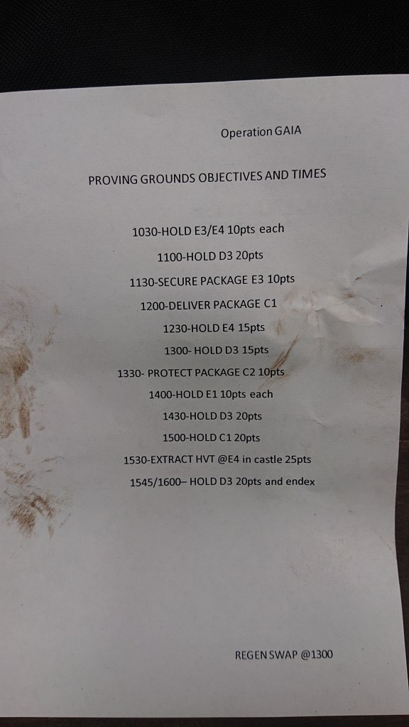 The game day plan runs on the same structure as I’ve played England games before, a list of timed objectives to be held during the course of the day. There’s no lunch break, you pop in to resupply as and when needed so the game doesn’t stop. It seems very straightforward. Guns are chrono’d before entering the site but in reality, I noticed most players just walked straight past the chrono booth and in.