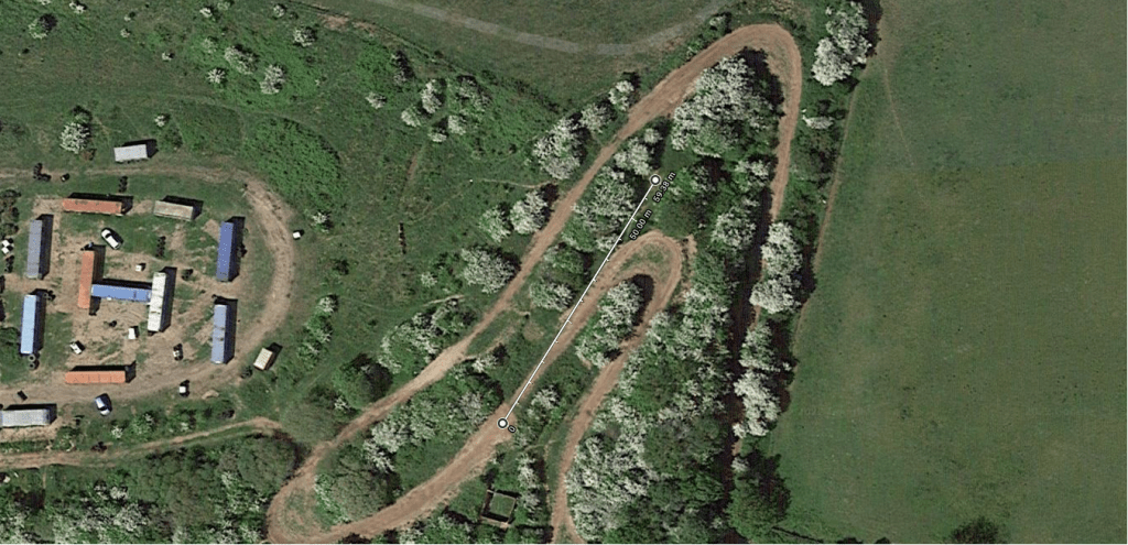 A quick check on Google maps afterwards, and this is roughly 60 metres, which is perfect. Looking back, it’s probably ten metres further than I wanted for this demo and I could have gone almost halfway to the target and still been comfortably outside MED if it were a game situation, but that looked really close actually and far too easy. I’ll leave that for the filmmakers.