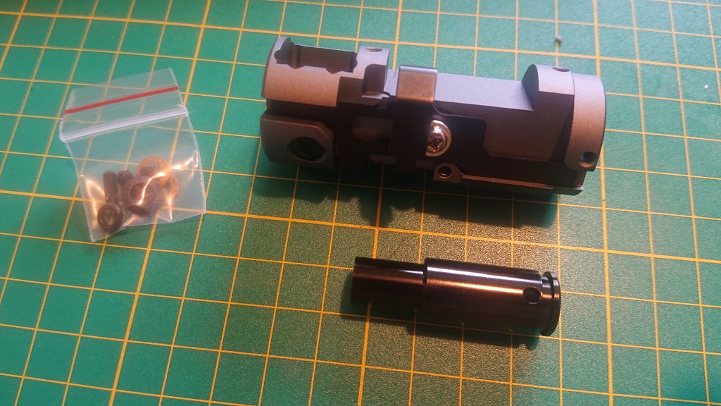 Apologies for the poor lighting, I have to face the window for deliveries. Amazon, surplus, fast food etc. Straight out of the packet, the grey finish on it is absolutely beautiful, not that it matters. But it was worth appreciating. What AA have done is change the TDC type adjuster and gone back to a slider, the same as the stock hop unit. But with the rest of the design features (the good ones) taken from the old red original one. The BB stoppers are still there, the barrel spacer that holds the bucking securely in place it still there. But overall, it just feels much better engineered. After I finished stroking the lovely matt grey finish, I decided to get a beer down and install it.