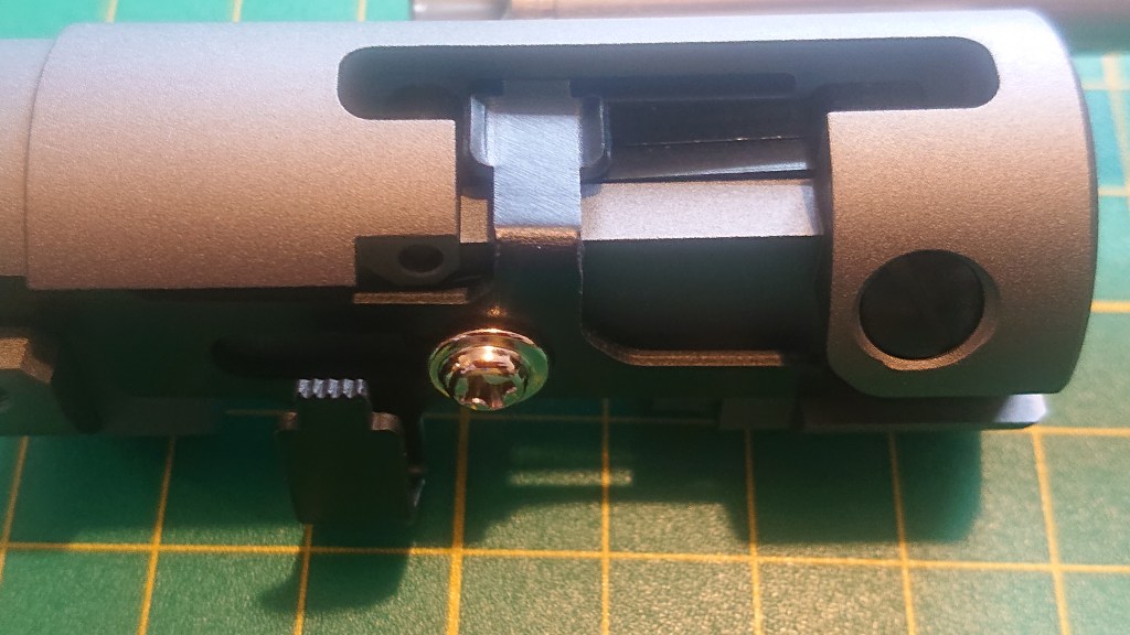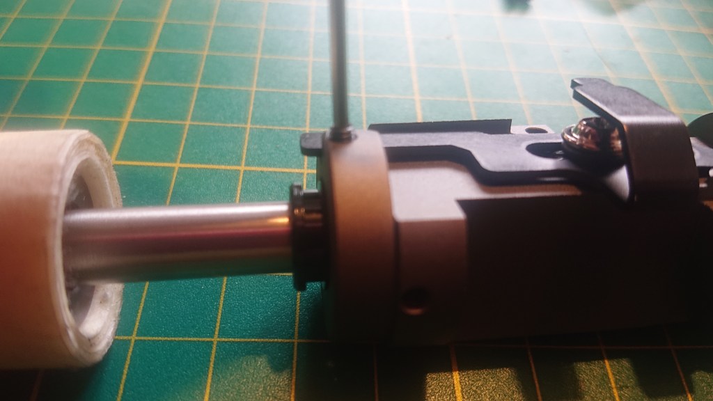 There are no instructions but there is a nice exploded diagram on the back of the box, note that there are a couple of washers and an o-ring to add to the slider first. I’m wondering how well this will actually work. The clicky sliders I hate, last VSR I was fixing that had one would shoot straight because the sweet spot was in between clicks meaning I couldn’t get it set as well as it should. What I like most about both the AA original unit, and TDC’s done properly like the Gunsmithy, are that you get an infinite range of adjustment. At a static 60m target, little deviations are going to make a difference at the other end, so it has to be bang on. Thankfully this V2 isn’t a clicker, so I’m happy. There’s no movement in the polymer arm that I can see, and the slider does apply even pressure across it, which is good.