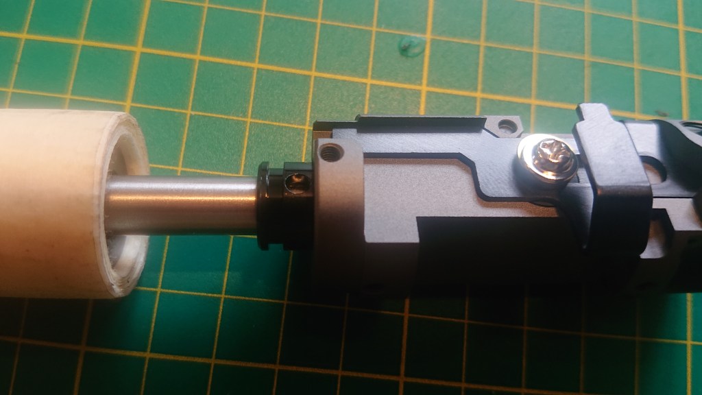 In terms of nubs, there is a little rubber one supplied. Many moons ago, I bought some Skeees 3D printed nubs (very precisely made) specifically for the AA chamber, and because I run softer buckings (50-60 degree) I prefer to have a hard nub so that it doesn’t deform under pressure. It fits the oval-shaped hole on the V2 so it’s going in. The bucking of choice here is the Modify X-Range in 55 degree flavour, which is my weapon of choice and fits nicely into the Modify SSx 430mm steel barrel. Its a very snug fit, which is good but I had to hold the barrel spacer to stop the bucking pushing back and out of position.