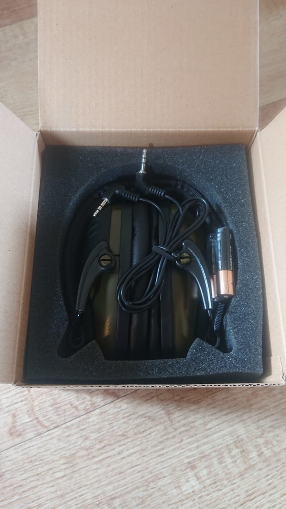 I’ve bagged a pair of these off Amazon (link to buy here), a recommendation from a friend who was doing some cqb himself. They’re a much more wallet friendly option for starters at only £35, and I’d be more comfortable camouflaging them up as a result. Included in the box are the headset, which folds up nice and small, two AAA batteries and a 3.5mm to 3.5mm jack plug wire – this connects into the bottom of one ear and can then be routed into your radio so basically you’re getting the quiet environmental noises enhanced around you and a feed from your comms in one package. Comes in a range of colours but I’ve just opted for OD because I’m a drab kind of guy.