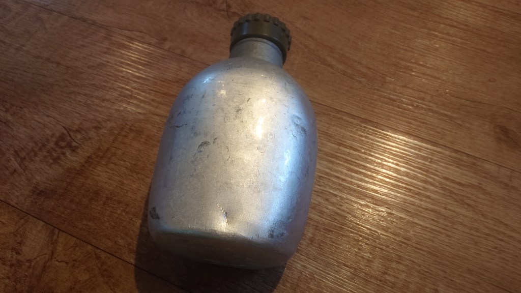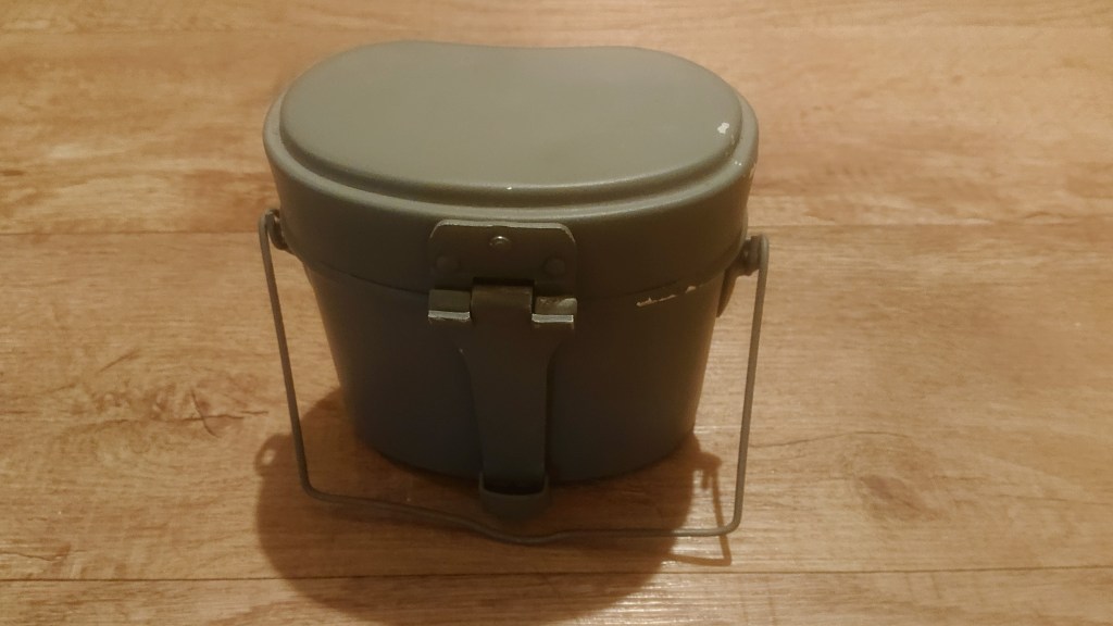 To do all the cooking, I could take my smaller Crusader metal mug and lid, or it’s a good excuse to use the larger bucket and pan combo that is the East German mess tin set. Or at least I think it is, there’s no markings on it anywhere to indicate origin, probably a repro, but the design is good and it’s been sat on my shelf for years. Being a larger container means I can stuff a few bits of food inside, perhaps some powdered soups and sauces or ration packs.