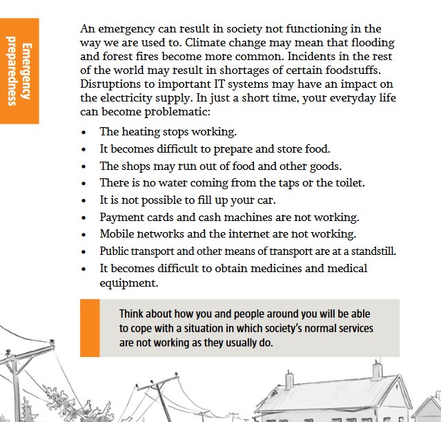 Ignoring all the doom-mongering and zombie apocalypse ideas, I did have a read a couple of days ago about the preparedness leaflet given to all citizens of Sweden. Here’s the link to the PDF. It’s a good read. There was one section I read a few times.