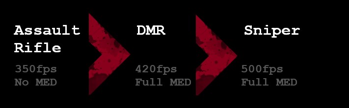 MED is the Minimum Engagement Distance, usually 20-30m depending on the site, put in place to stop people taking high powered hits up close. Which is right. The FPS in the diagram will vary from site to site as well, so please check in advance. Usually, the DMR must be locked to semi auto fire only, and this must be mechanically locked rather than electronic programming which can of course be undone during a game. I know some sites that insists on only one bb in the air at a time; you must wait for your first shot to hit before sending a follow up shot.