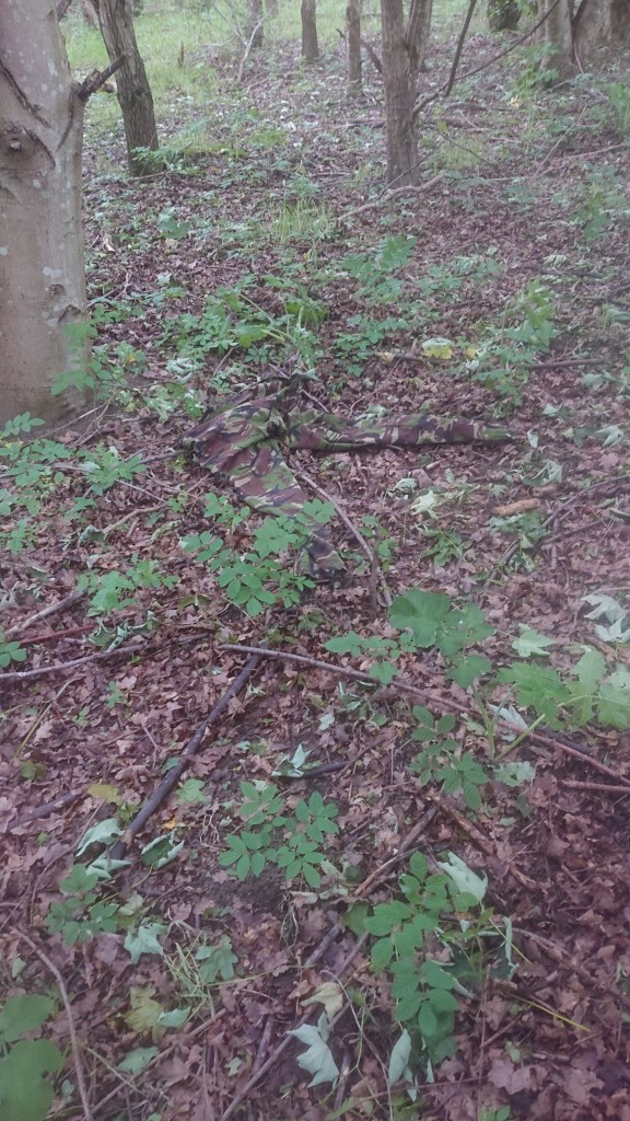 This was a few years ago, an attempt to create a colour-matched pattern using a desert DPM base. A mix of grey and brown spray paints helped create a very miserable looking “dead suit” which works well in extremely brown winter environments and mud but struggles in spring and autumn to break up the shape. The left arm here blends well with very little 3D but note how much green still exists in the background.